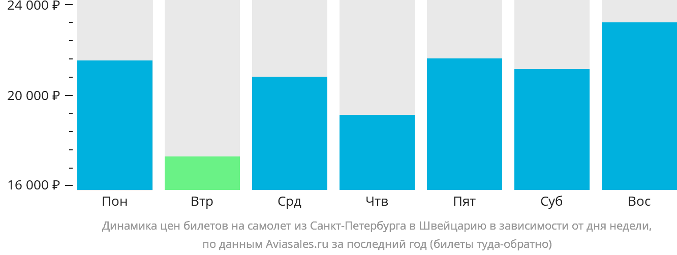 По статистике, самый доступный вариант рейсов из Санкт-Петербурга в Швейцарию — по вторникам, их средняя стоимость — 17 388 рублей . Наиболее дорогие рейсы — по воскресеньям, их средняя стоимость — 23 018 рублей . Стоит учесть, что вылеты в предпраздничные дни, как правило, дороже. Мы надеемся, что эти данные помогут вам наиболее эффективно планировать свои путешествия.