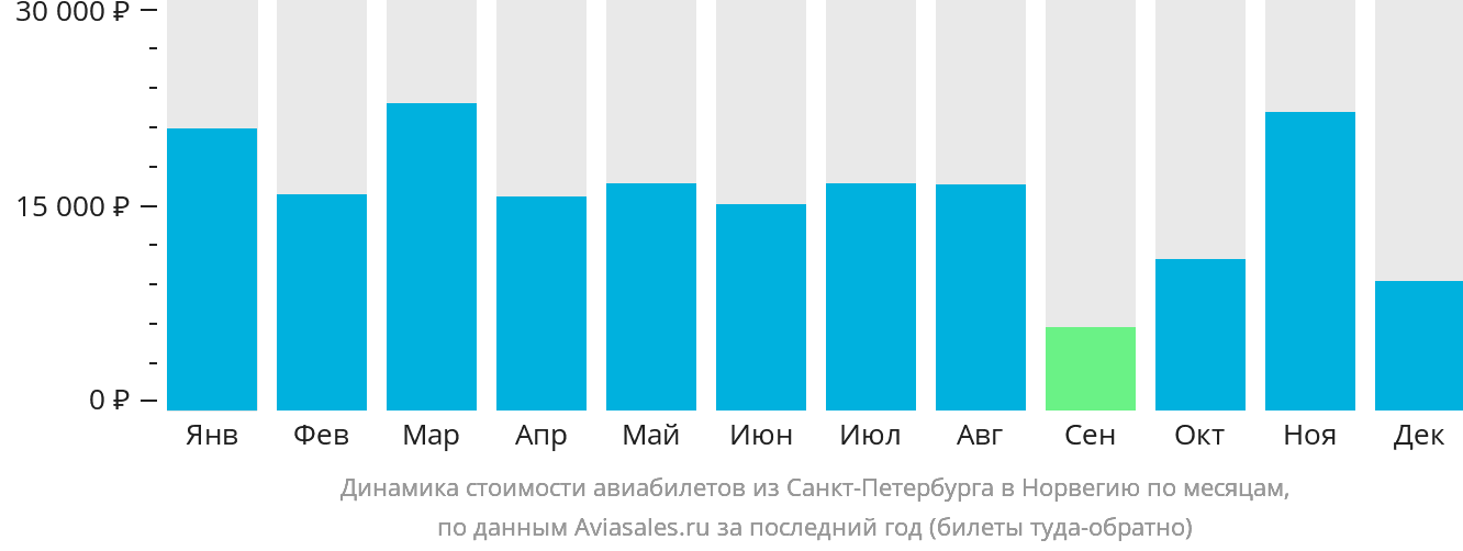 Стоимость перелёта всегда зависит от времени путешествия. График позволит сравнить цены на авиабилеты из Санкт-Петербурга в Норвегию, проследить динамику изменения их стоимости и найти оптимальное предложение.