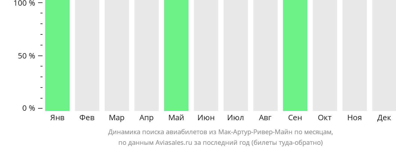 Чаще всего билеты из Мак-Артур-Ривер-Майн берут на октябрь. Низким сезоном для покупки билетов считается сентябрь, ноябрь и декабрь.