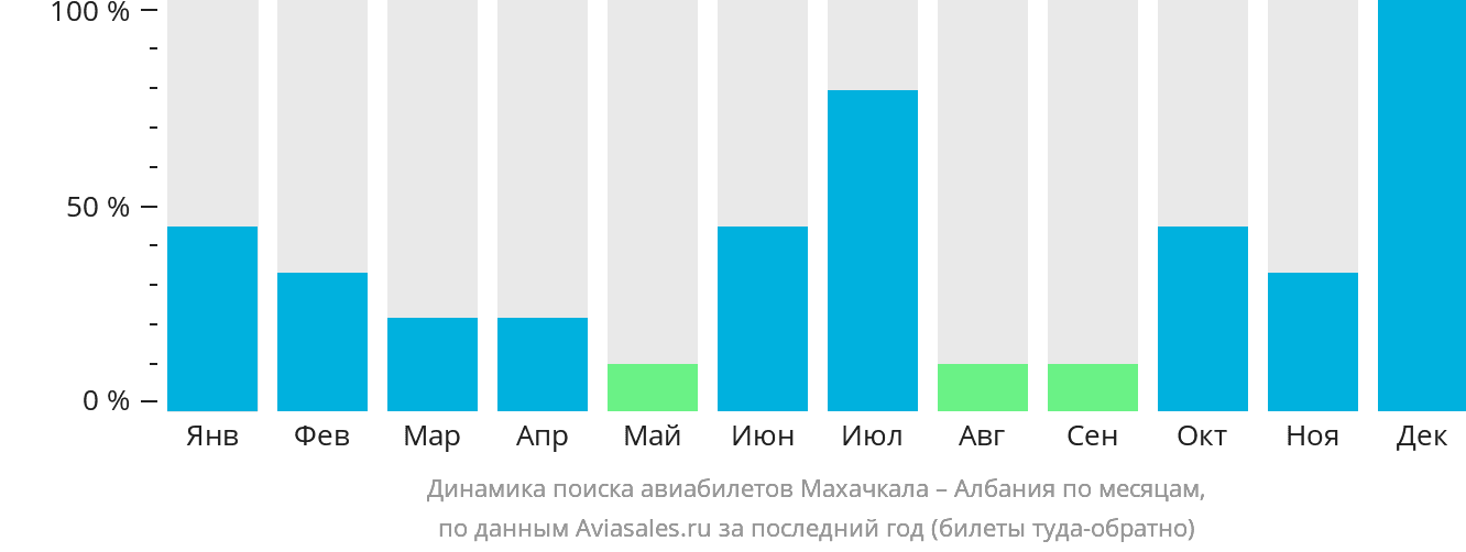В период высокого спроса рекомендуется приобретать авиабилеты из Махачкалы в Албанию заранее. Например, число поисковых запросов в декабре достигает максимума в 9 запросов , а в мае их количество снижается до 11 от максимума.