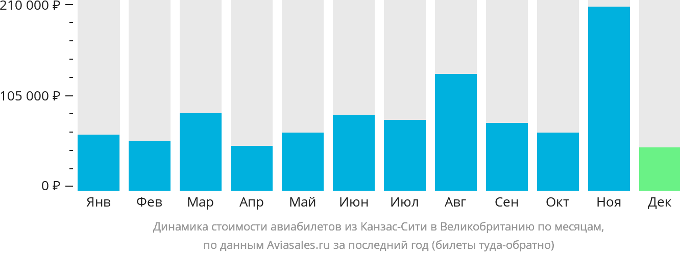 Стоит отметить, что направление Канзас-Сити – Великобритания пользуется наибольшей популярностью в январе, марте и октябре. В этот период средняя стоимость авиабилетов составляет 50 274₽ .