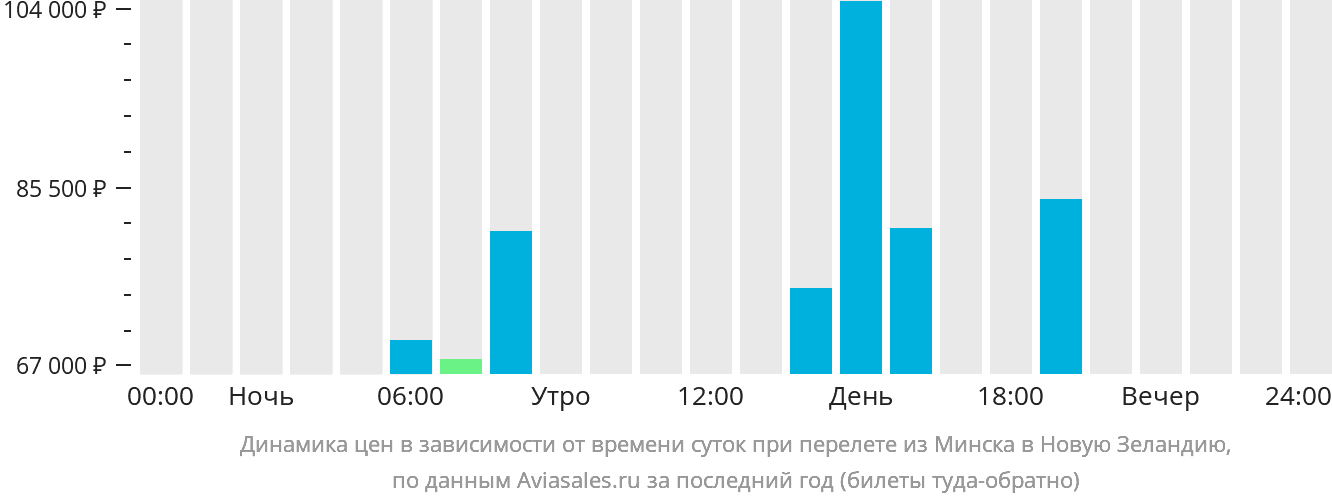 График показывает стоимость вылета в зависимости от времени суток. Например, средняя стоимость билета из Минска в Новую Зеландию утром составляет 74 685 рублей , а вечером 84 185 рублей . Оцените все условия и выберите оптимальное предложение.