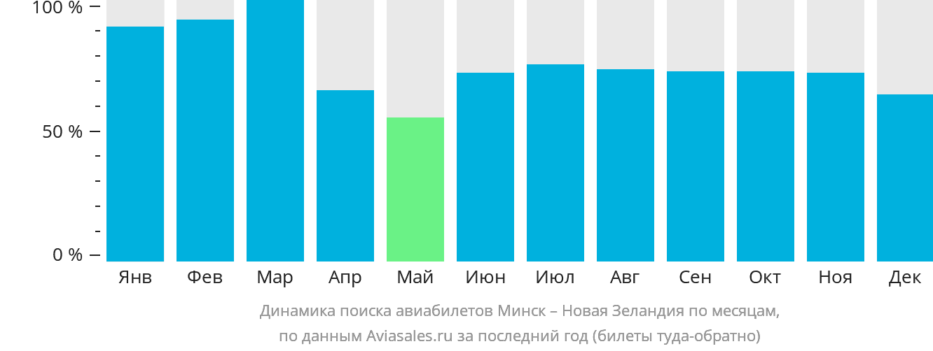 В период высокого спроса рекомендуется приобретать авиабилеты из Минска в Новую Зеландию заранее. Например, число поисковых запросов в марте достигает максимума в 227 запросов , а в мае их количество снижается до 55 от максимума.