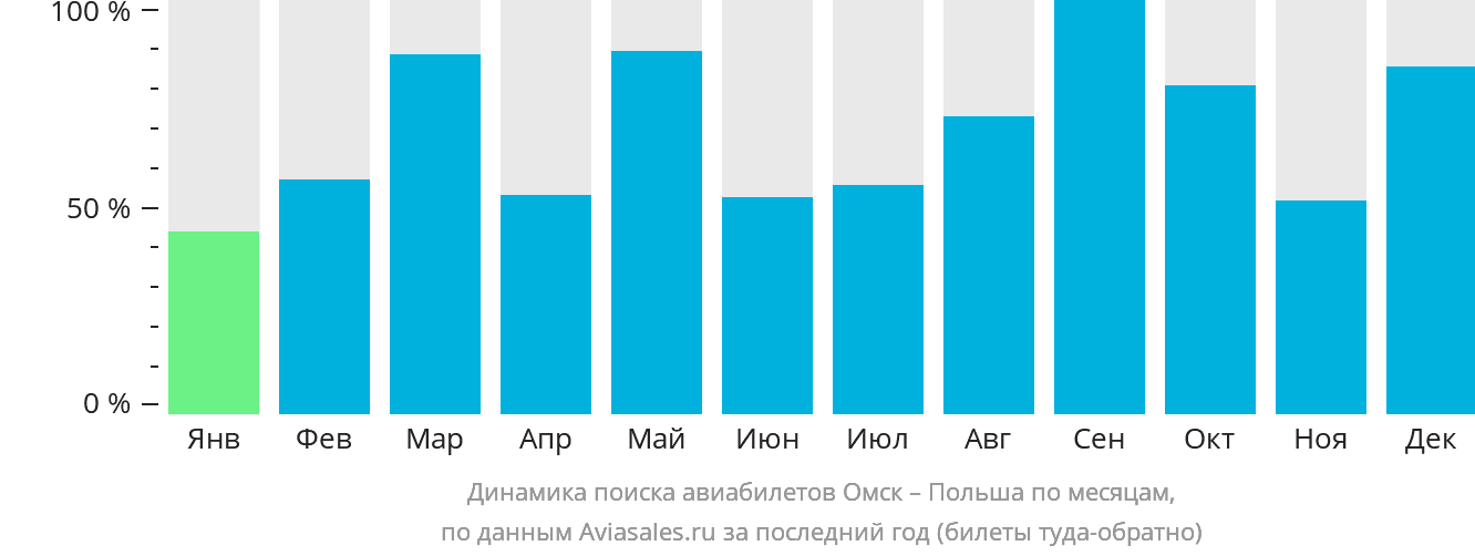В период высокого спроса рекомендуется приобретать авиабилеты из Омска в Польшу заранее. Например, число поисковых запросов в сентябре достигает максимума в 133 запросов , а в январе их количество снижается до 44 от максимума.