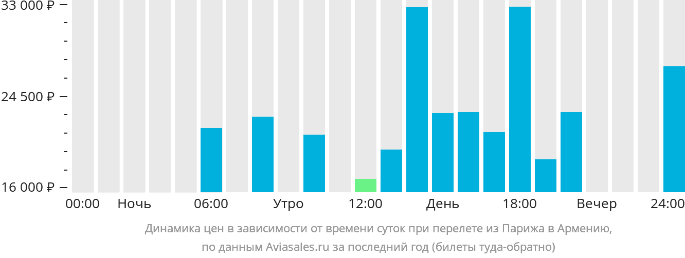 График показывает стоимость вылета в зависимости от времени суток. Например, средняя стоимость билета из Парижа в Армению утром составляет 20 239 рублей , а вечером 22 967 рублей . Оцените все условия и выберите оптимальное предложение.
