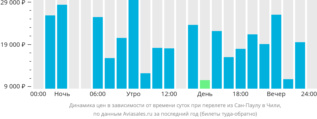 График показывает стоимость вылета в зависимости от времени суток. Например, средняя стоимость билета из Сан-Паулу в Чили утром составляет 18 937 рублей , а вечером 19 240 рублей . Оцените все условия и выберите оптимальное предложение.