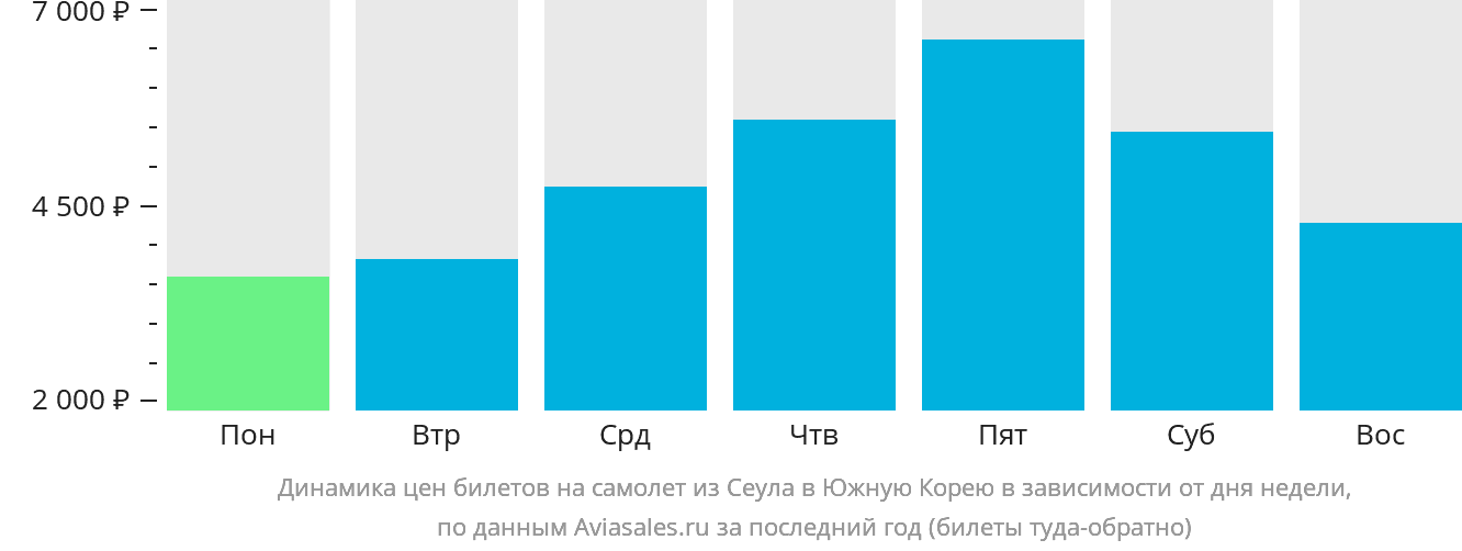 По статистике, самый доступный вариант рейсов из Сеула в Южную Корею — по понедельникам, их средняя стоимость — 3 608 рублей . Наиболее дорогие рейсы — по пятницам, их средняя стоимость — 6 493 рублей . Стоит учесть, что вылеты в предпраздничные дни, как правило, дороже. Мы надеемся, что эти данные помогут вам наиболее эффективно планировать свои путешествия.