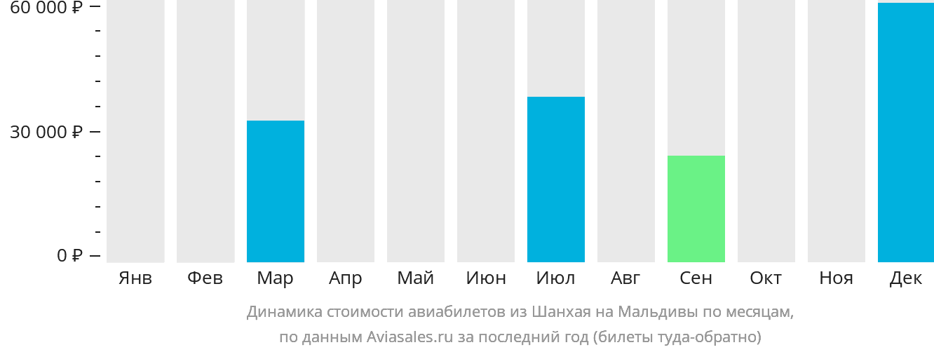 Стоимость перелёта всегда зависит от времени путешествия. График позволит сравнить цены на авиабилеты из Шанхая на Мальдивы, проследить динамику изменения их стоимости и найти оптимальное предложение.