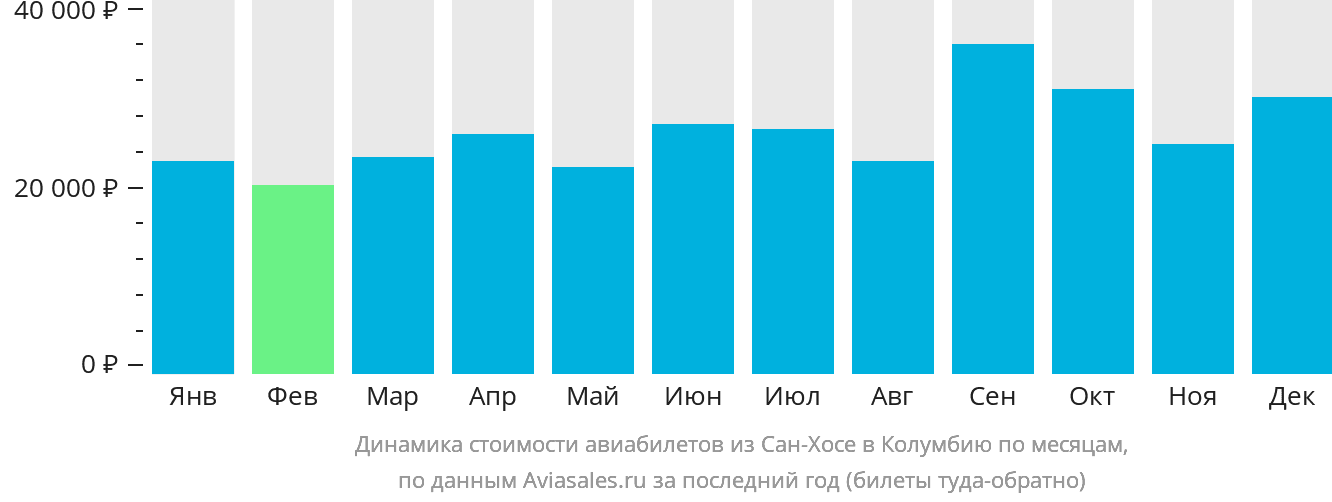Стоит отметить, что направление Сан-Хосе – Колумбия пользуется наибольшей популярностью в январе, феврале и декабре. В этот период средняя стоимость авиабилетов составляет 26 515₽ .