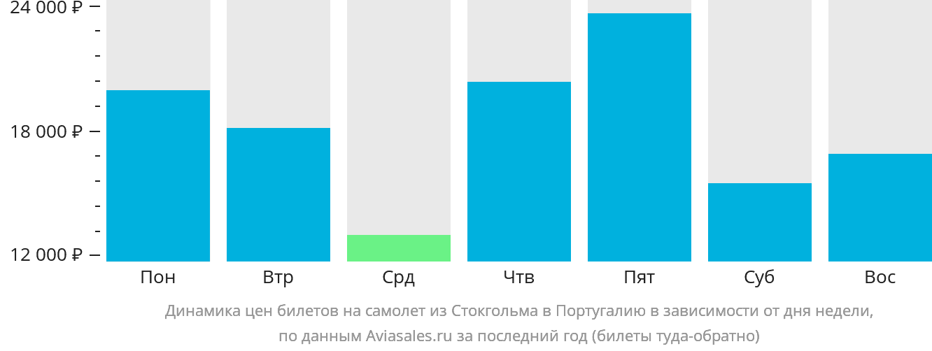 Стоимость авиабилетов из Стокгольма в Португалию не представляет собой фиксированную и постоянную сумму. Она зависит от множества факторов, в том числе и от дня вылета. Динамика изменений видна на графике.