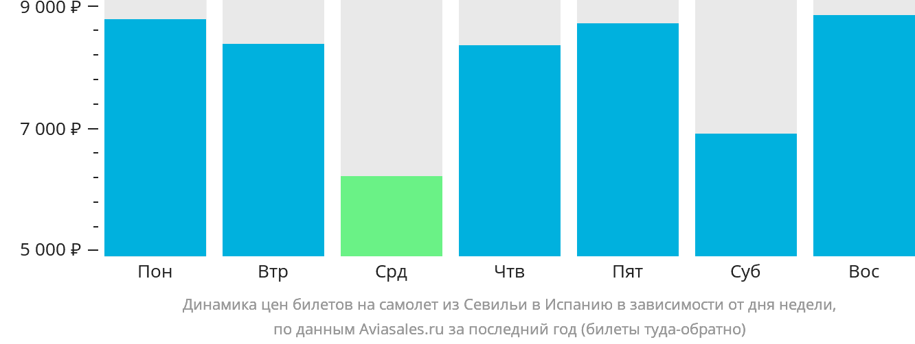 По статистике, самый доступный вариант рейсов из Севильи в Испанию — по средам, их средняя стоимость — 6 235 рублей . Наиболее дорогие рейсы — по воскресеньям, их средняя стоимость — 8 745 рублей . Стоит учесть, что вылеты в предпраздничные дни, как правило, дороже. Мы надеемся, что эти данные помогут вам наиболее эффективно планировать свои путешествия.