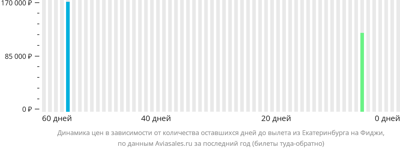 Стоимость перелёта всегда зависит от времени путешествия. График позволит сравнить цены на авиабилеты из Екатеринбурга на Фиджи, проследить динамику изменения их стоимости и найти оптимальное предложение.