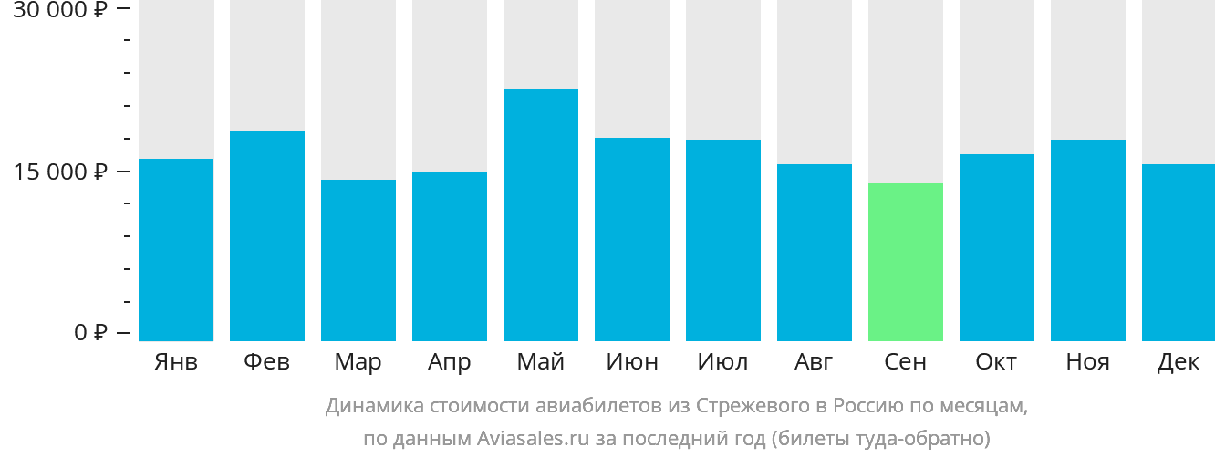 Стоимость перелёта всегда зависит от времени путешествия. График позволит сравнить цены на авиабилеты из Стрежевого в Россию, проследить динамику изменения их стоимости и найти оптимальное предложение.