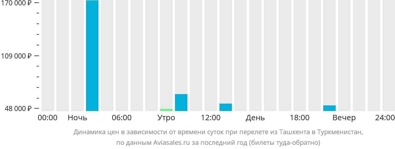 График показывает стоимость вылета в зависимости от времени суток. Например, средняя стоимость билета из Ташкента в Туркменистан утром составляет 57 936 рублей , а вечером 53 628 рублей . Оцените все условия и выберите оптимальное предложение.