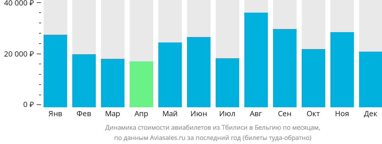 Стоимость перелёта всегда зависит от времени путешествия. График позволит сравнить цены на авиабилеты из Тбилиси в Бельгию, проследить динамику изменения их стоимости и найти оптимальное предложение.