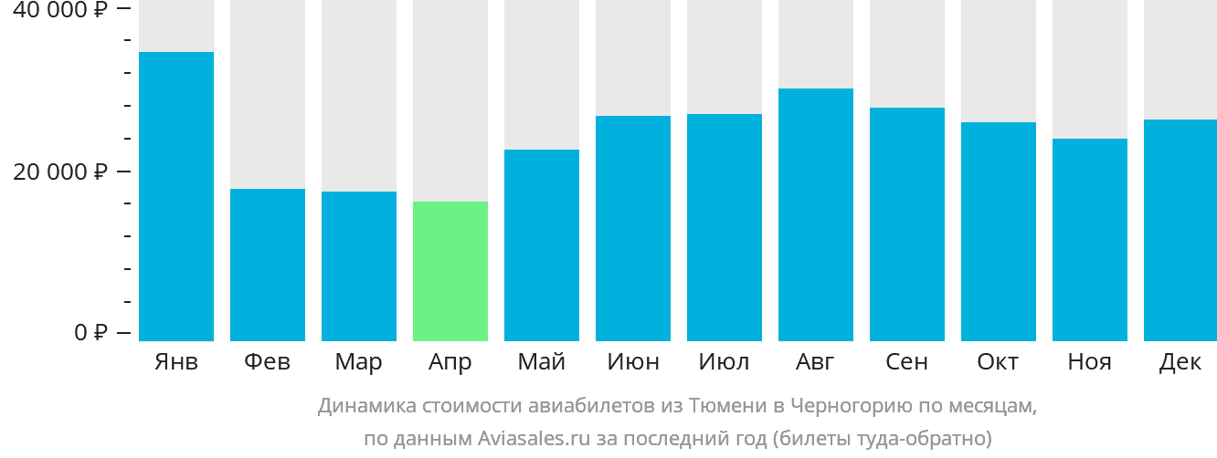 Стоимость перелёта всегда зависит от времени путешествия. График позволит сравнить цены на авиабилеты из Тюмени в Черногорию, проследить динамику изменения их стоимости и найти оптимальное предложение.