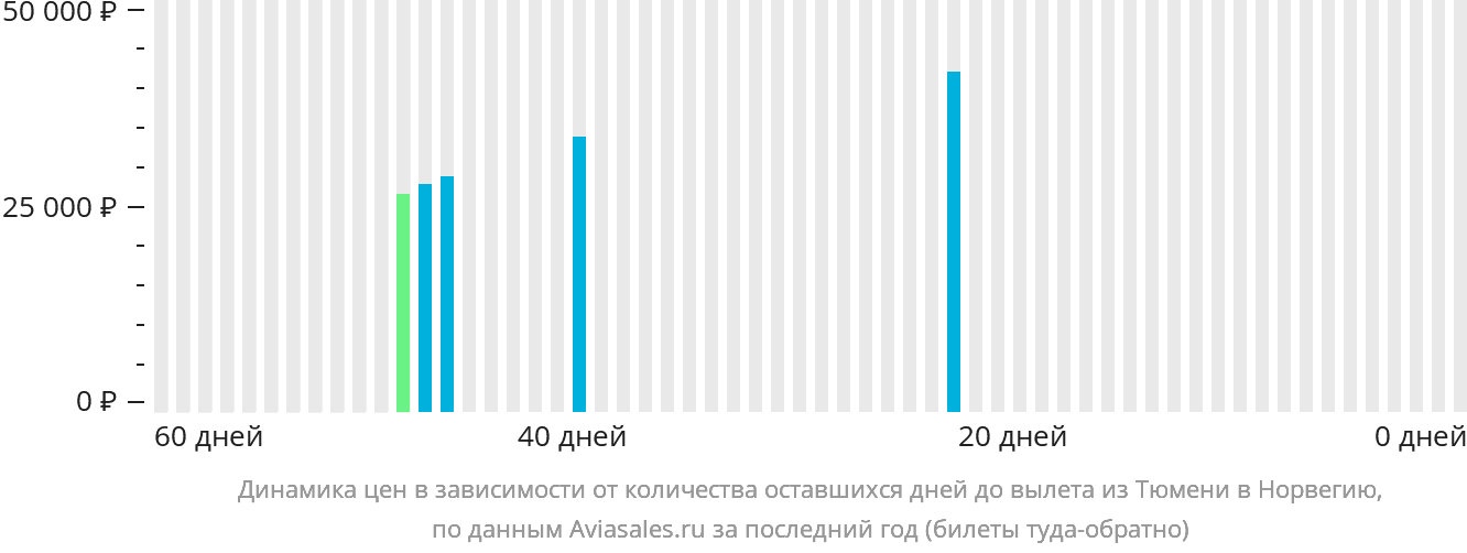 Посмотрите, как менялась цена на авиабилеты из Тюмени в Норвегию в зависимости от времени покупки. С начала продаж их стоимость меняется в среднем на 56%. Минимальная цена по направлению из Тюмени в Норвегию — за 48 дней до вылета , примерно 26 269 рублей . Максимальная цена по направлению из Тюмени в Норвегию — за 23 дней до вылета , примерно 41 069 рублей . В большинстве случаев раннее бронирование помогает сэкономить, воспользуйтесь этим!