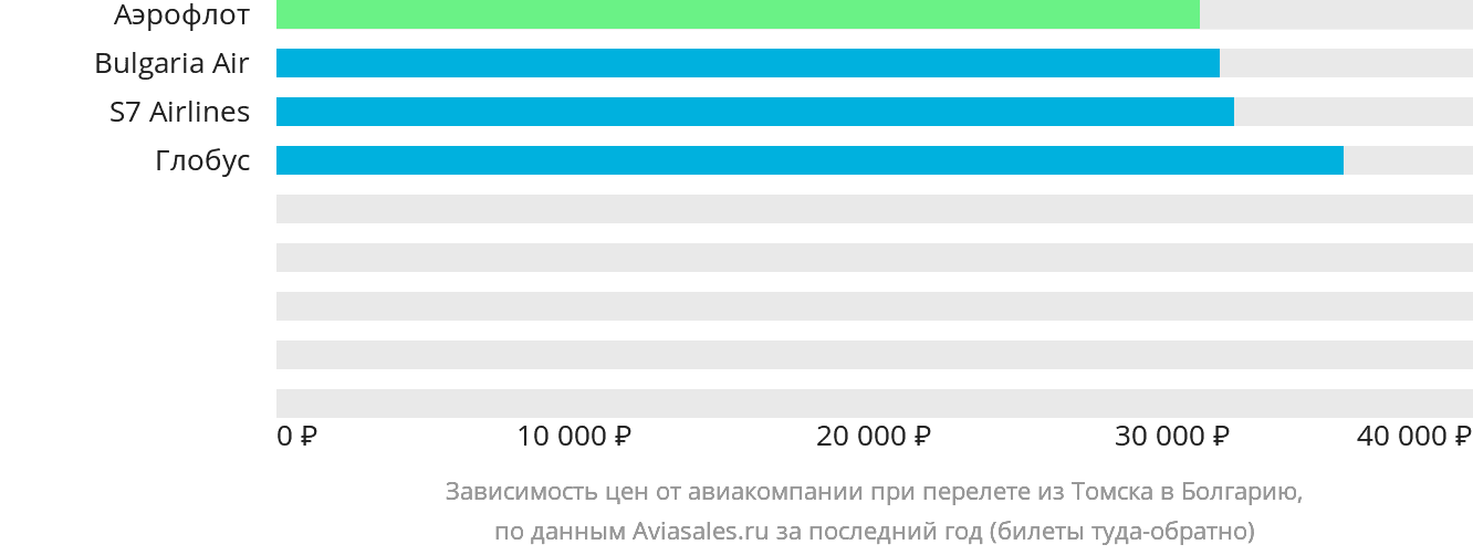Статистика поможет выбрать рейс, ориентируясь на свои финансовые возможности, а также пожелания в плане комфорта и условий перелёта. Наиболее низкие цены на авиабилеты из Томска в Болгарию предлагает Аэрофлот, самые высокие цены — Глобус.
