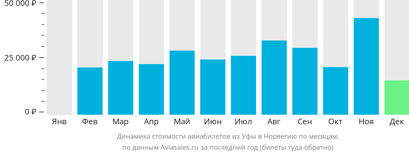 Стоимость перелёта всегда зависит от времени путешествия. График позволит сравнить цены на авиабилеты из Уфы в Норвегию, проследить динамику изменения их стоимости и найти оптимальное предложение.