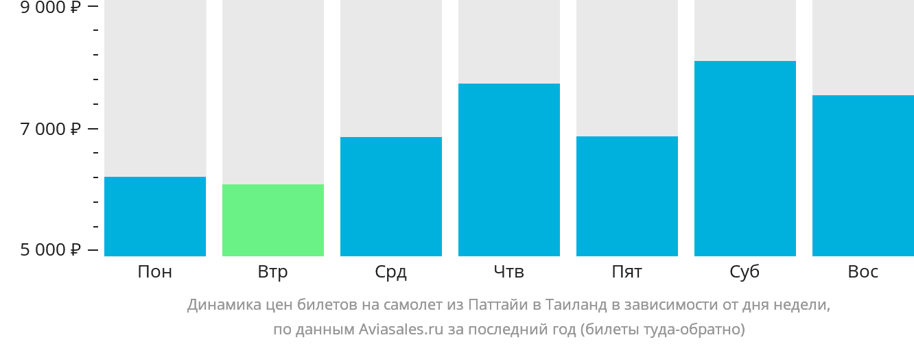 По статистике, самый доступный вариант рейсов из Паттайи в Таиланд — по вторникам, их средняя стоимость — 6 104 рублей . Наиболее дорогие рейсы — по субботам, их средняя стоимость — 8 034 рублей . Стоит учесть, что вылеты в предпраздничные дни, как правило, дороже. Мы надеемся, что эти данные помогут вам наиболее эффективно планировать свои путешествия.