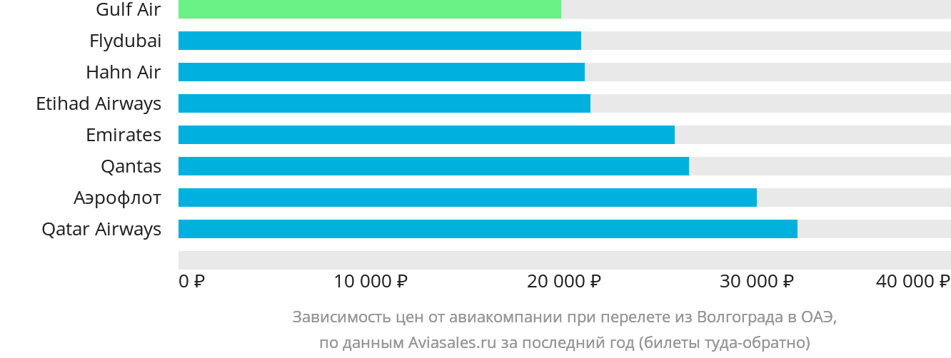 Статистика поможет выбрать рейс, ориентируясь на свои финансовые возможности, а также пожелания в плане комфорта и условий перелёта. Наиболее низкие цены на авиабилеты из Волгограда в ОАЭ предлагает Gulf Air, самые высокие цены — Qatar Airways.