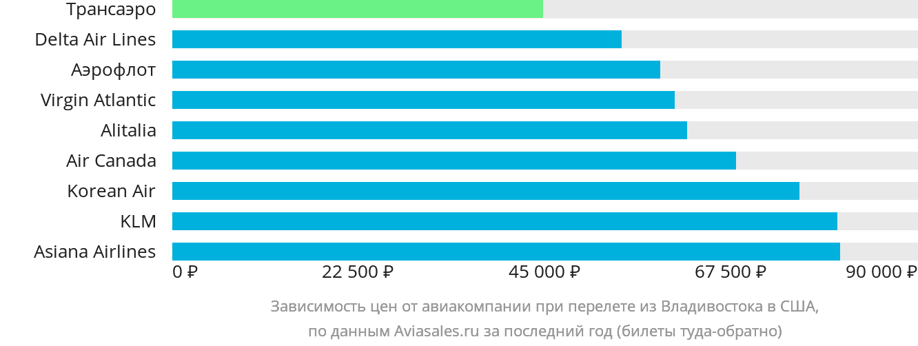 Статистика поможет выбрать рейс, ориентируясь на свои финансовые возможности, а также пожелания в плане комфорта и условий перелёта. Наиболее низкие цены на авиабилеты из Владивостока в США предлагает Трансаэро, самые высокие цены — Asiana Airlines.