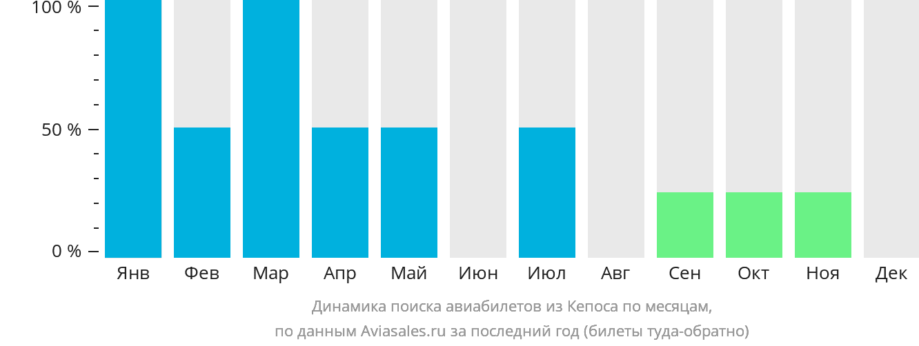Чаще всего билеты из Кепоса берут на январь и октябрь. Низким сезоном для покупки билетов считается сентябрь, ноябрь и декабрь.