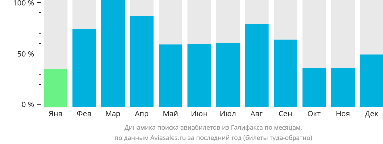 Чаще всего билеты из Галифакса берут на июль, август и октябрь. Низким сезоном для покупки билетов считается апрель, ноябрь и декабрь.