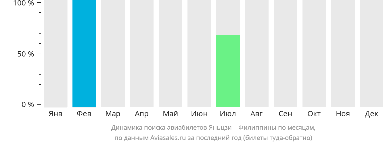 В период высокого спроса рекомендуется приобретать авиабилеты из Яньцзи на Филиппины заранее. Например, число поисковых запросов в феврале достигает максимума в 6 запросов , а в июле их количество снижается до 67 от максимума.